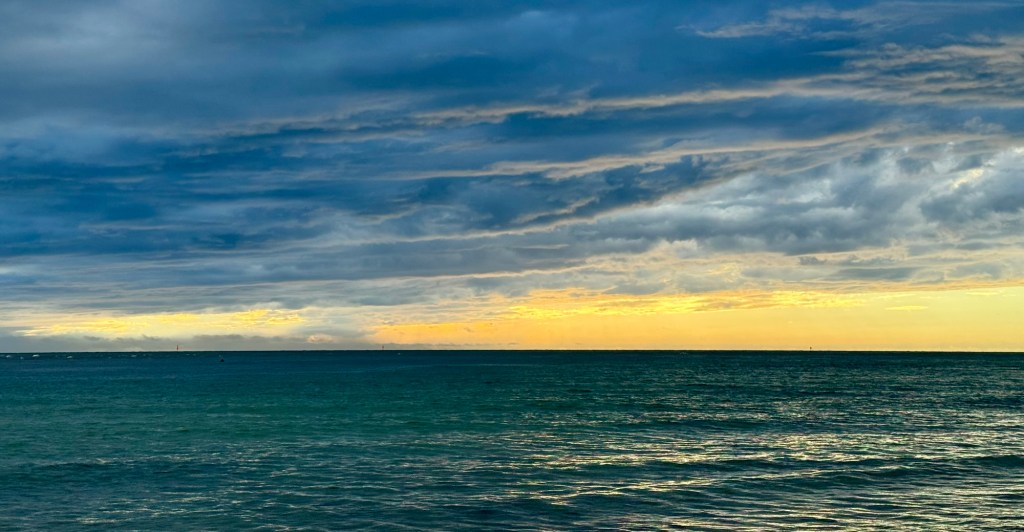 Gyorsan irányt változtattunk, és elmentünk a Honeymoon-szigetre, ahol a drámai égbolt igazi mesterművet festett a hullámok fölé. A mennydörgés és a sós szél közepette kincseket keresve sétáltunk a parton – tetőtől talpig elázva, nevetve, élettel telve.