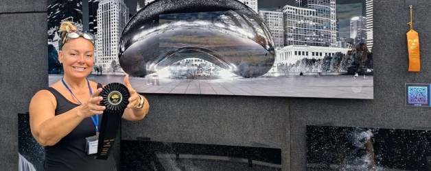 Zsuzsanna Luciano smiles while holding her “Award of Merit” ribbon toward the camera, standing in front of her artwork “Imagine” — a striking photograph of Chicago’s Cloud Gate (“The Bean”) beneath the Milky Way. The reflection of the sky and city buildings shimmers across the glossy surface, symbolizing the harmony between urban light and the star-filled night.