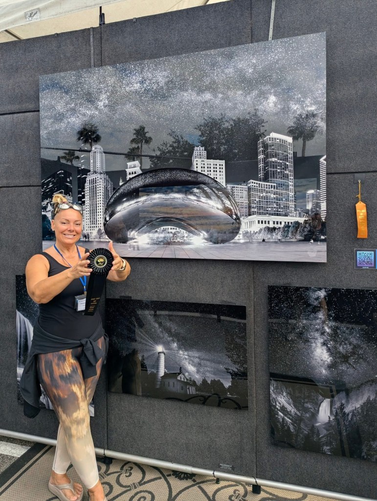 Zsuzsanna Luciano stands smiling in front of her art display at the 60th Space Coast Art Festival, proudly holding her Award of Merit ribbon. Behind her hangs her large photographic artwork titled “Imagine,” depicting Chicago’s Cloud Gate (“The Bean”) under a stunning Milky Way sky, symbolizing the union of city lights and starlight. Additional night-sky and waterfall photographs are displayed below, all printed on glossy aluminum panels within her booth.