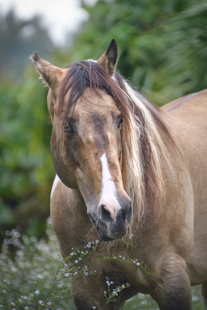 A once-fearful stallion lifting his gaze with renewed confidence.