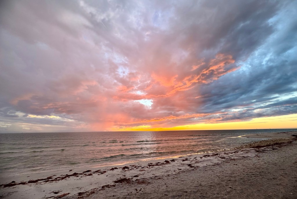We quickly adjusted our plan and headed to Honeymoon Island, where the moody sky painted a masterpiece above the waves. Between thunder rumbles and salty wind, we wandered the shore treasure-hunting as the rain soaked us head to toe â laughing, drenched, and completely alive.
